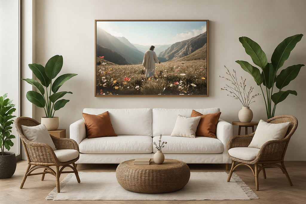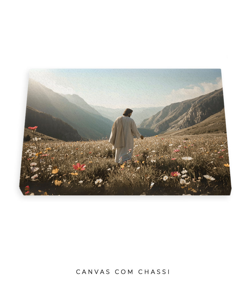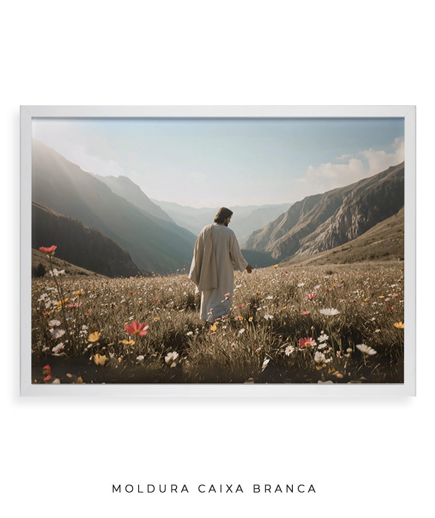 Quadro Cristão: Jesus no campo de Flores | Alta resolução 4K Mateus 🙏🌼 - 6:28-30 e 1 Pedro 1:24